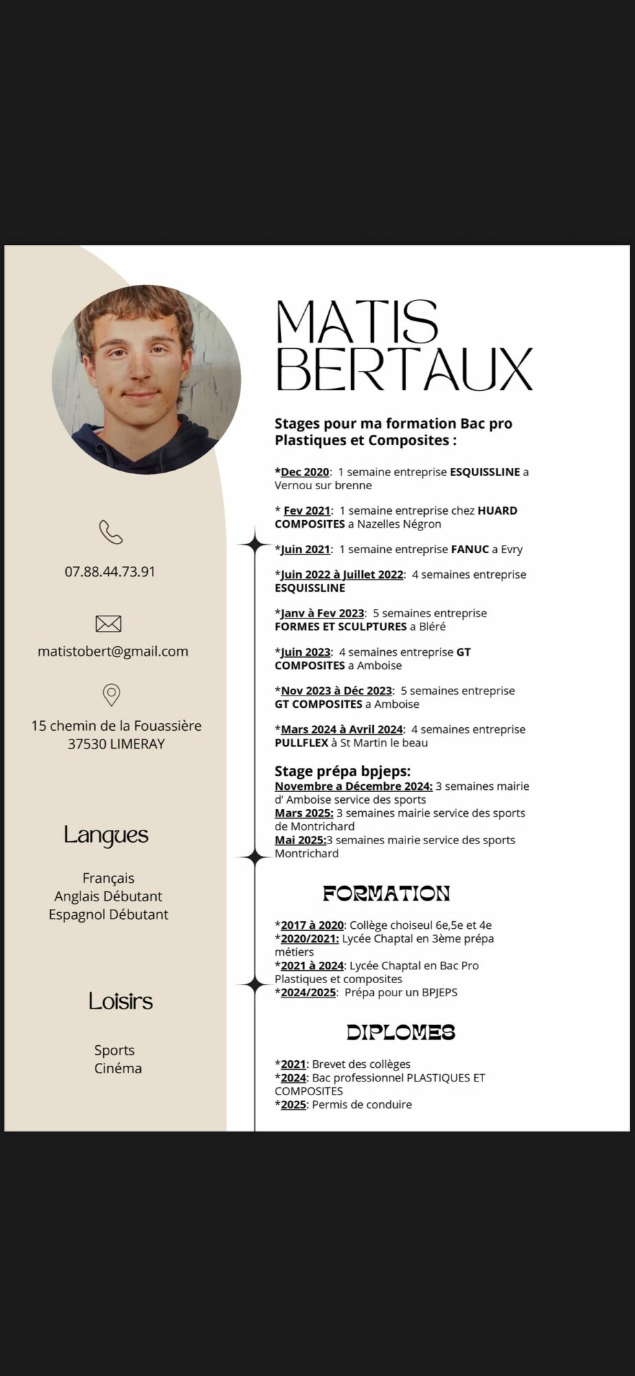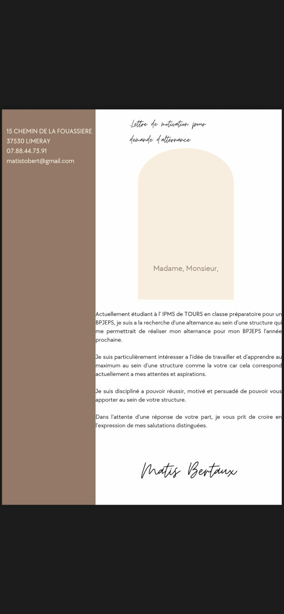 Candidature Matis Bertaux : Alternance BPJES